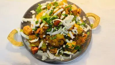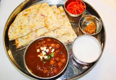Flour bread stuffed with potatoes and minced onion baked in a clay oven and served with channa masala