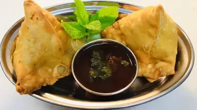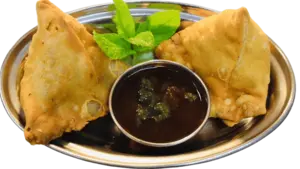 Two triangular savory pastries filled with spicedpotatoes & peas served with chutney